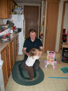 David bought a CD that has our wedding song on it. We had it, but for some odd reason, a whole bunch of our CD's just went missing. We have no idea why or where they went. David purchased a new one, and played it this afternoon. Claire was in the middle of "sweeping" the kitchen floor, and when the music came on, she dropped everything and ran to dance. She and David danced it up in the kitchen. She's so cute!